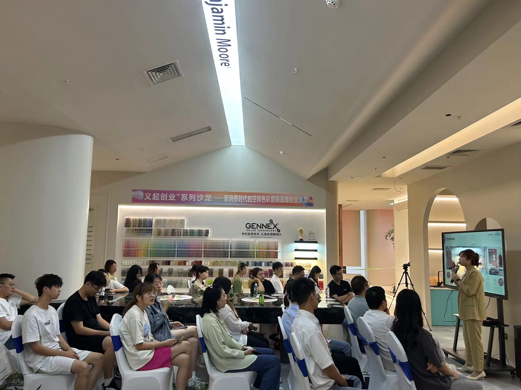 5月27日下午,在义乌市人力资源和社会保障局的精心筹划与组织下,义乌工商职业技术学院创意设计学院携手义乌本杰明色彩创意空间在义乌市家居城国际馆隆重举办了“新消费时代的空间色彩营销创业沙龙”主题活动。此次活动有幸邀请到本杰明.摩尔的色彩专家和中国流行色协会色彩教育委员会委员邵永红先生作为主讲嘉宾,为与会者带来了一场富有深度的空间色彩营销策略的主题分享。