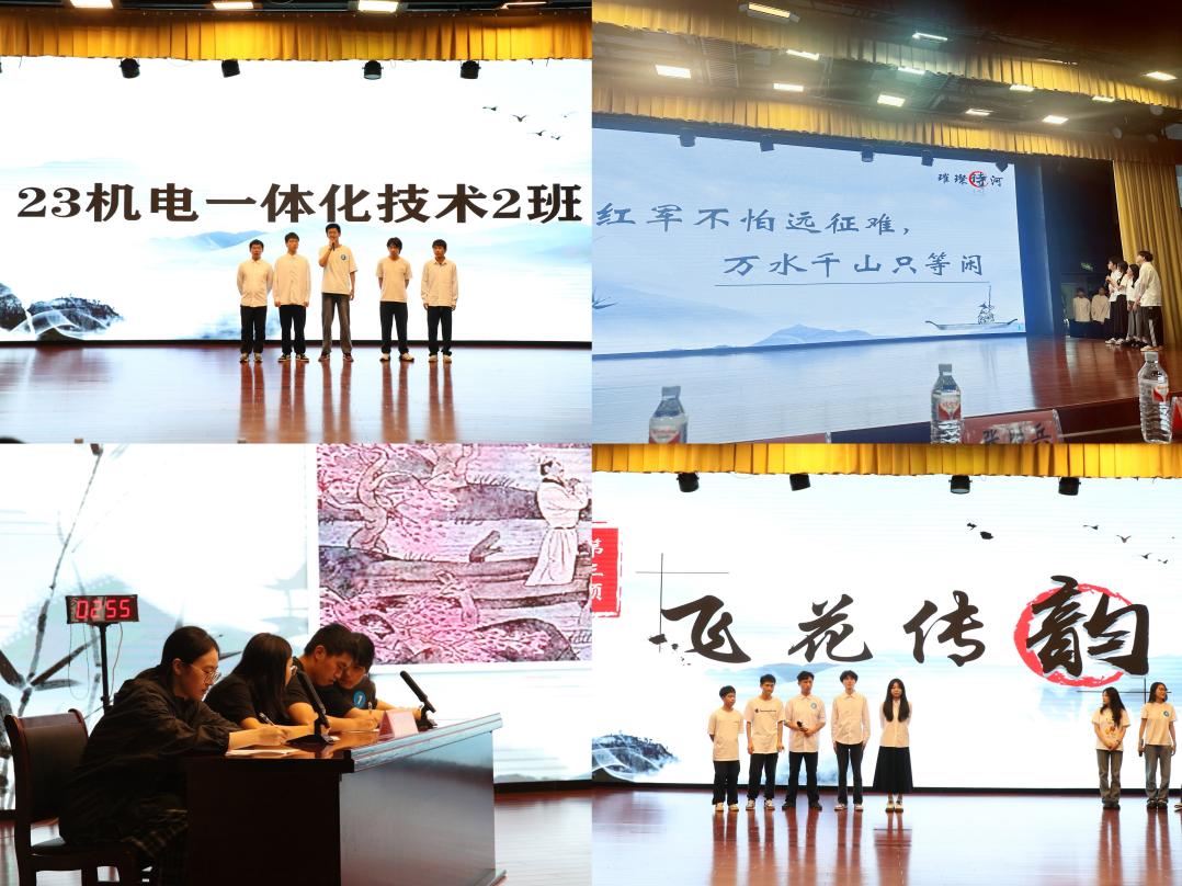 决赛分为“璀璨诗河”、“博闻广识”和“飞花传韵”三个环节,分别考验了参赛选手的诗词知识储备、应变能力和团队合作精神。各组选手凭借扎实的诗词功底、广博的知识面和精湛的表达能力,展示了他们对以诗词为代表的优秀传统文化的热爱和敬畏,为观众呈现了一场精彩美妙的诗词盛宴,让大家感受到了诗词的无穷魅力。最终,经过激烈的角逐,23机电一体化技术2班获得一等奖,23计算机应用技术1班等三个班级获得二等奖,22印刷数字图文技术2班等4个班级获得三等奖,现场还评出了最佳风采奖和最佳组织奖。