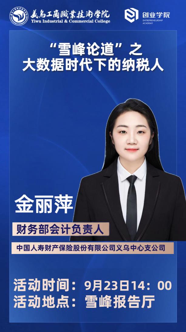 9月23日下午,创业学院雪峰报告厅内座无虚席,中国人寿财产保险股份有限公司义乌中心支公司财务部会计负责人金丽萍受邀为创业学子们带来了一场以大数据时代下的纳税人为题的讲座,旨在帮助创业学子们掌握这一时代背景下的税务管理技能。