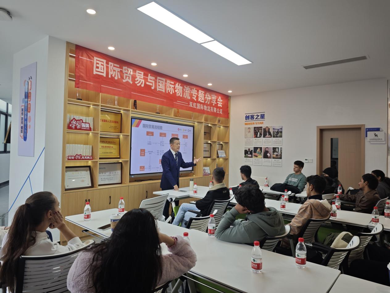 实践周期间,我院为增强国际学生对贸易和物流行业的理解,提升其专业技能,在国际创客园成功举办了“孔子讲堂”第四十九讲——国际贸易与物流专题分享会。来自24级国际商务(商务汉语方向)班及对商贸物流感兴趣的国际学生逾30人参加了本次分享会。