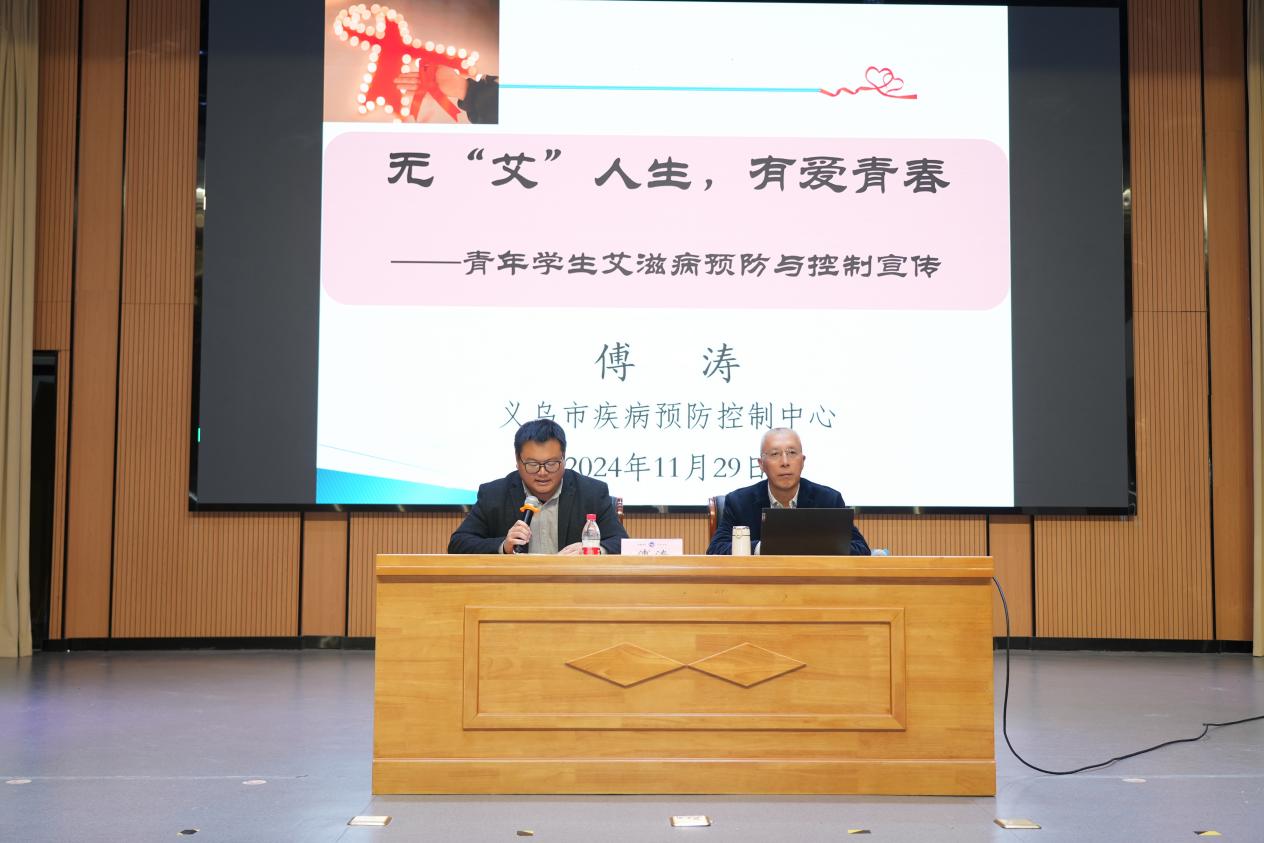 11月29日下午,在第37个“世界艾滋病日”即将到来之际,学校在大学生活动中心开展了“无‘艾’人生,有爱青春”为主题的青年学生艾滋病预防与控制宣传讲座。本次活动特邀义乌市疾病预防控制中心原书记、主任,主任医师傅涛主讲。200余名学生代表现场聆听。