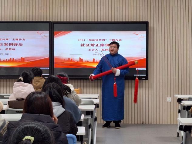 为深入贯彻落实习近平法治思想,增强校园尊法学法守法用法氛围,马克思主义学院于2024年12月5日晚,在春晗楼207成功举办了以“社区矫正案例普法”为主题的普法沙龙,活动邀请了义乌同悦社会工作服务中心的中级社工师赵鲜丽女士。这场活动不仅是一次法治知识的深度传递,更是一场法治精神的生动演绎,旨在通过具体而生动的社区矫正案例,激发全校师生对法律的尊崇与守护,共同点亮法治校园的璀璨明灯。