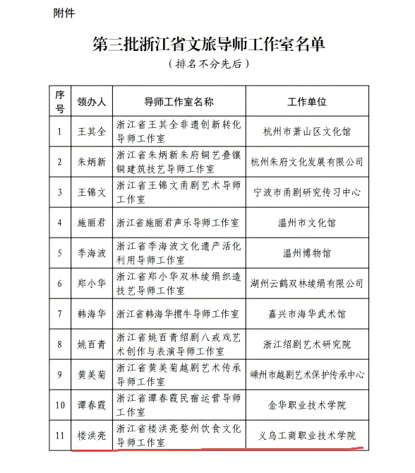 近日,为进一步推动我省文化广电和旅游领域高素质技能人才的成长,充分发挥名家名师在“文化浙江”“诗画浙江”建设中的示范引领和骨干带动作用,经全省范围内的申报推荐和专家严格评审,浙江省正式公布了第三批文旅导师工作室名单(浙文广旅人〔2024〕24)。此次共有24家导师工作室脱颖而出,人文旅游学院楼洪亮老师所带领的工作室位列其中。