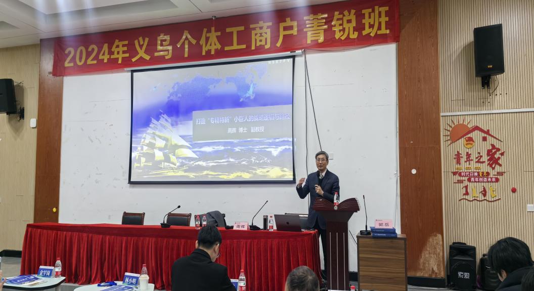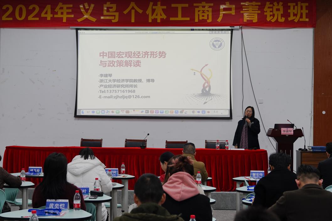 市场监管总局登记注册局个体私营经济发展处处长郭岳从个体工商户发展历史和现状、《促进个体工商户发展条例》的重点政策内容、市场监管总局促进个体工商户发展的工作安排三个方面展开对国家政策的解读;浙江大学经济学院教授、产业经济研究所所长李建琴以义乌经济为切入点,对中国宏观经济形势与政策进行解读;江苏大学管理学院战略管理研究所副所长、副教授周辉根据个体工商户存在的特点,对个体工商户进行转型升级、如何成打造“专精特新”小巨人的战略逻辑与路径展开剖析。