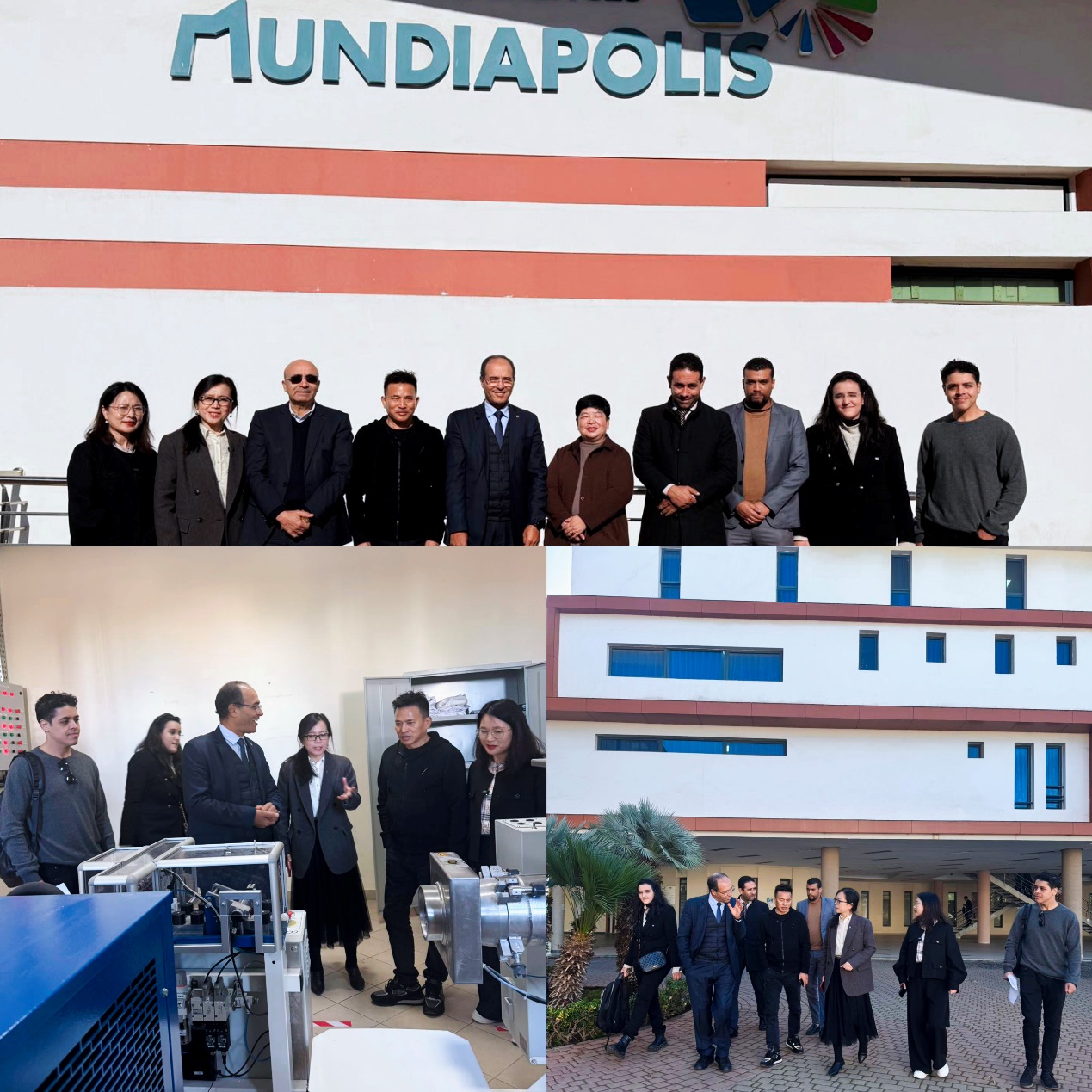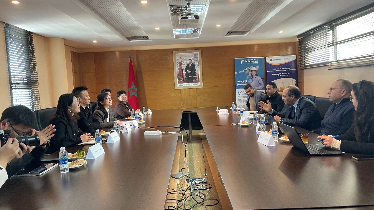 【摩洛哥,卡萨布兰卡】当地时间12月24日,摩洛哥义乌商学院合作院校——蒙迪亚波利斯大学成功举办了一场校企交流座谈会。本次活动特别邀请到义乌籍中资企业摩洛哥F.S NanNan Shoes factory傅文红董事长一行参与,蒙迪亚波利斯大学校长巴尔卡维、教务长比拉利亚等热情接待。座谈会旨在探讨教育与企业深度合作的新模式,共同推动中摩国际教育与产业的融合发展。