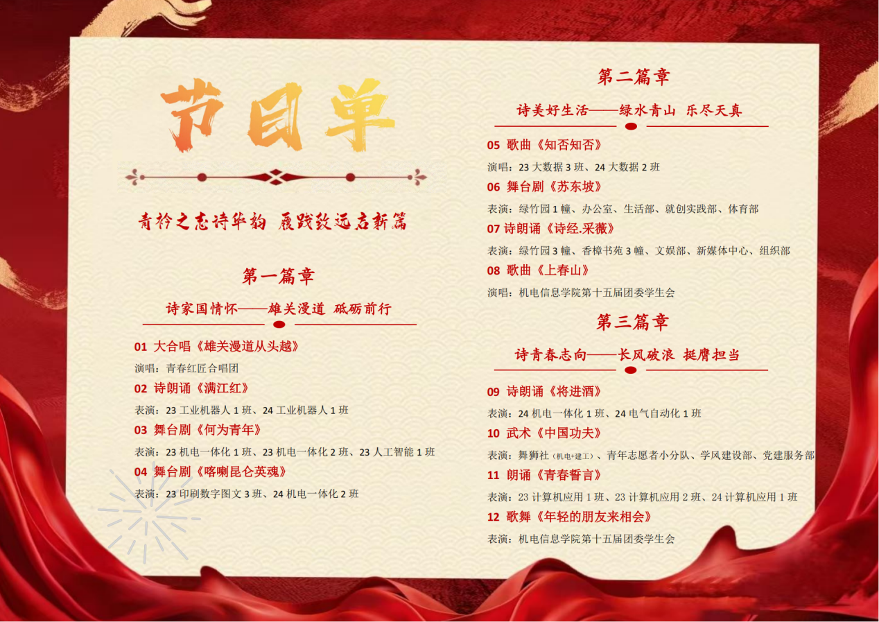 晚会节目形式多样,内容丰富,将诗词和歌曲、舞蹈、情景剧、武术等多种表演形式结合起来,既有以北宋文学家苏轼跌宕起伏的人生经历和诗词作品为内容演绎的舞台剧《苏东坡》、以喀喇昆仑戍边英雄事迹创作的舞台剧《喀喇昆仑英魂》和根据毛泽东同志在长征途中写下的六首诗谱曲的大合唱《雄关漫道从头越》这样的原创类作品,也有《将进酒》、《满江红》、《诗经.采薇》和《沁园春.长沙》等优秀经典诗词的创造性演绎,展现了学生对诗词文化的热爱和深层次领悟,抒发了学生对祖国的热爱、对美好生活的向往以及远大的青春志向。
