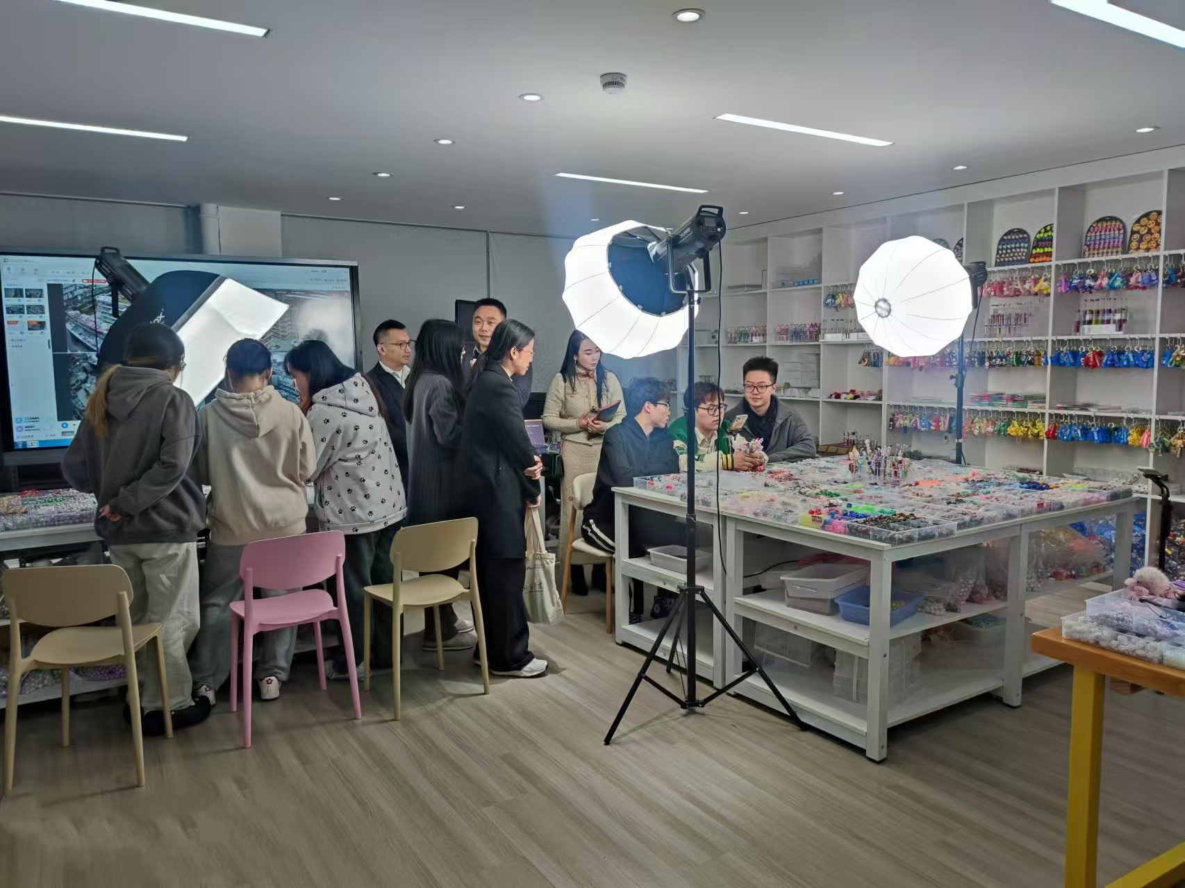 吕志伟一行先后参观了外语外贸学院的多语种跨境直播中心、数字品牌AI运营实训室、数字贸易实训基地等教学与实践基地,深入了解学校在创新创业、跨境电商直播等方面的典型做法和特色举措。