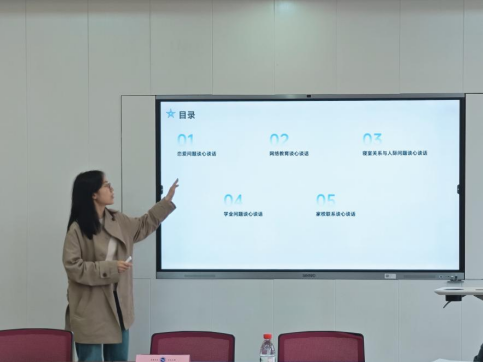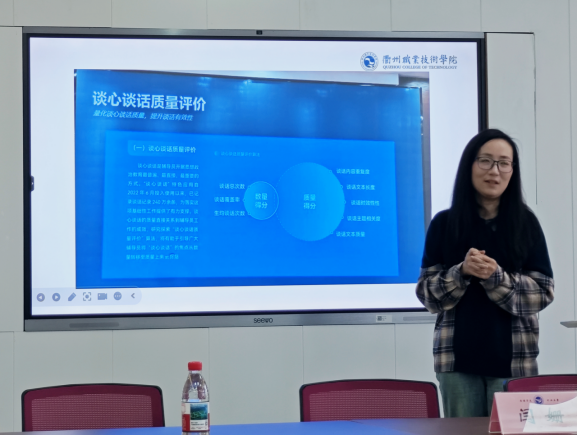 随后,建筑工程学院辅导员陈翔老师从恋爱、网络教育、寝室关系与人际问题、学业、家校联系五个方面,分场景分类别细化讲解了谈心谈话的流程及要点,并总结了“3+3”记录法,为学生工作队伍灵活运用谈话技巧提供了方法和指导。