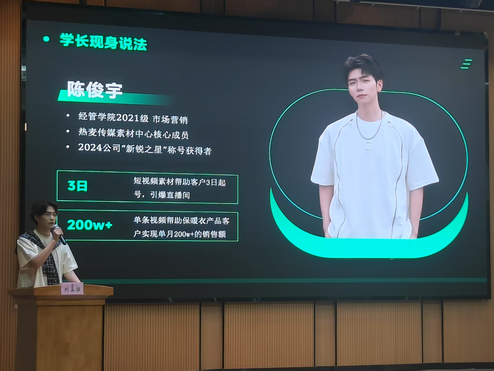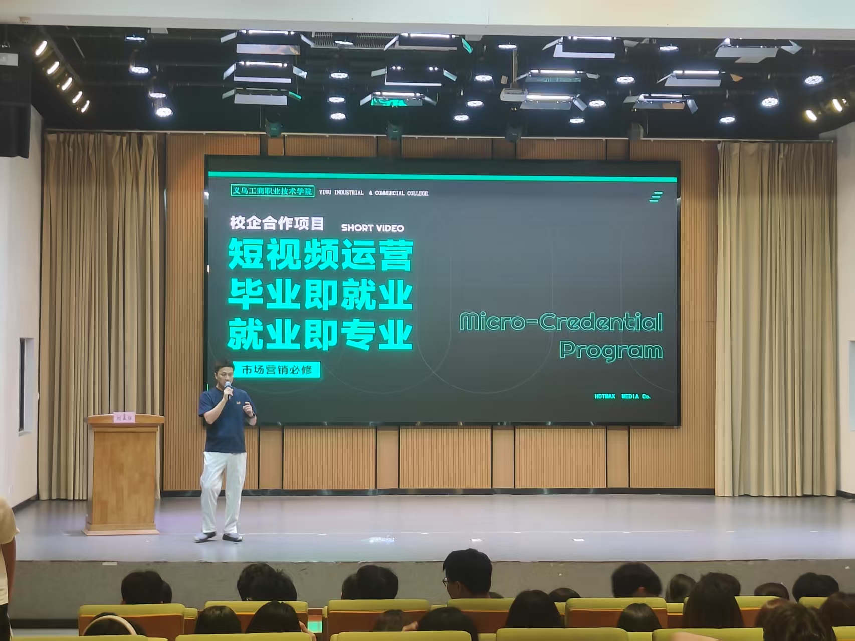 作为年孵化GMV超5亿元的行业标杆,热麦传媒深度解析抖音、快手、视频号等平台的流量算法逻辑,以“小商品带货短视频”为切入点,通过“选题策划-用户画像-数据优化”全流程拆解,揭秘爆款短视频的底层商业逻辑。在“Z世代对话Z世代”的环节,00后企业导师团以新生代视角分享个人从行业小白进阶为带货达人的成长秘籍,激发学生创新思维。