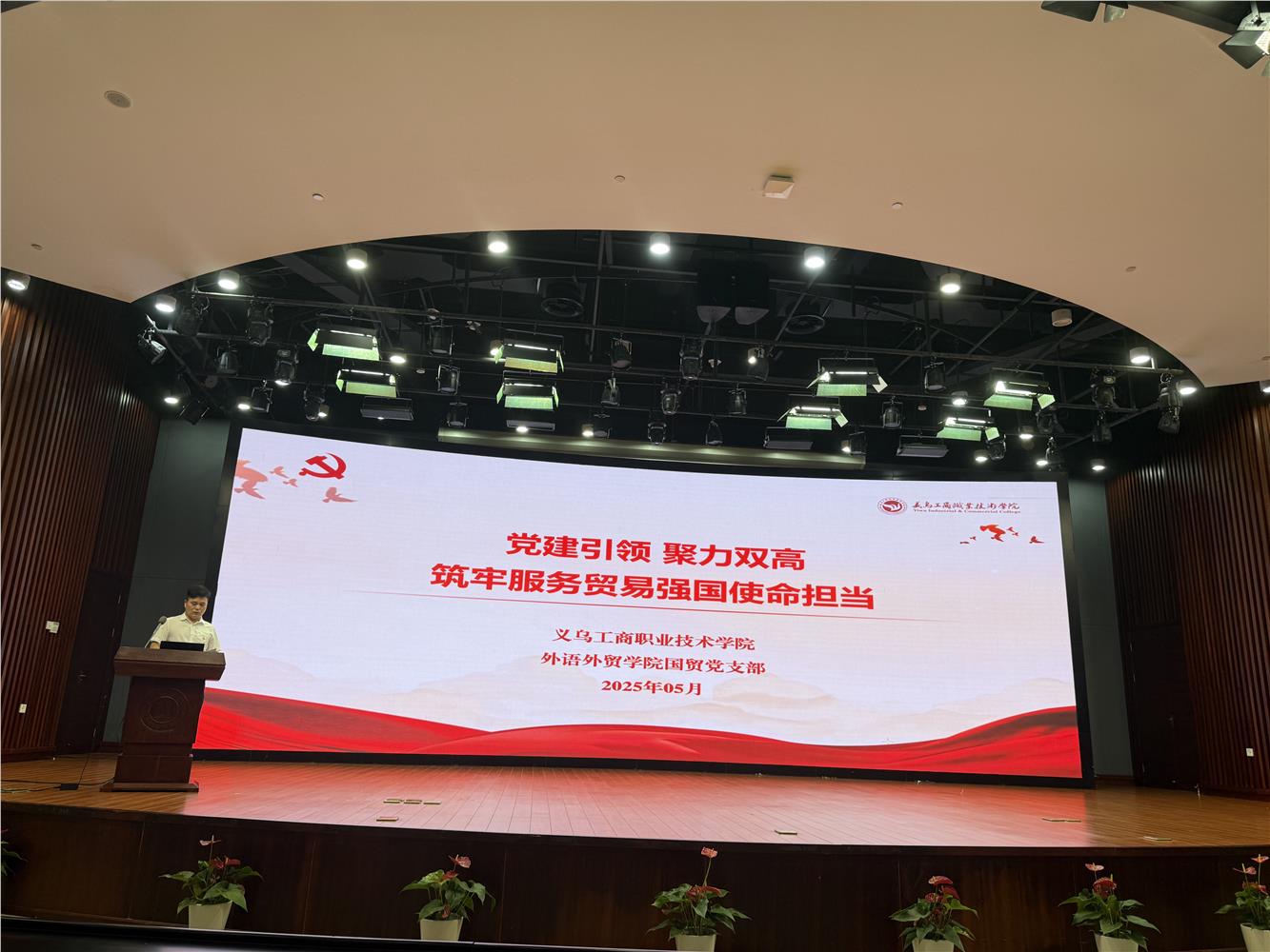 外语外贸学院国贸党支部负责人代表团队作了题为《党建引领 聚力双高—筑牢服务贸易强国使命担当》的经验分享汇报。他从政校行企携手,提升育人质量、红心筑梦引航,聚力服务地方、四化一体推进,推动义乌改革等三个方面系统介绍团队校企“1+1”党建联建模式、“基地+专家团+导师制”教育服务模式、“播勇者”多语跨境电商直播培训、现代学徒制实践育人等创新举措与实践成效,得到与会领导与兄弟院校的一致好评。