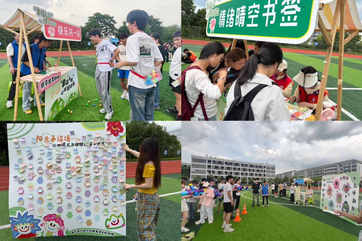 随后开展的“幸福之旅”心理游园会现场热闹非凡。游园会围绕“聆听心灵雨季”、“感受盛夏阳光”、“定格夏日晴空”三大主题,搭建起心灵成长的三重维度,引领大学生在心理疗愈、趣味挑战、艺术创作等多元互动体验中,开启一场与自我探索之旅。