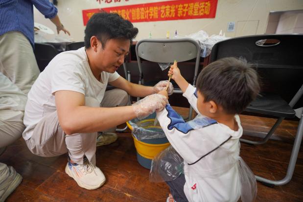 此次“亲子艺术课堂”在创意园报告厅温馨开课。斑斓的漆彩颜料与精妙的传统工艺交织,为课堂注入无限趣味,欢声笑语此起彼伏。校友们和老师们一起带着孩子重返母校,大手牵小手,共同走进非遗艺术的奇妙世界,在创作中感受传统文化的魅力,留下珍贵的亲子回忆。