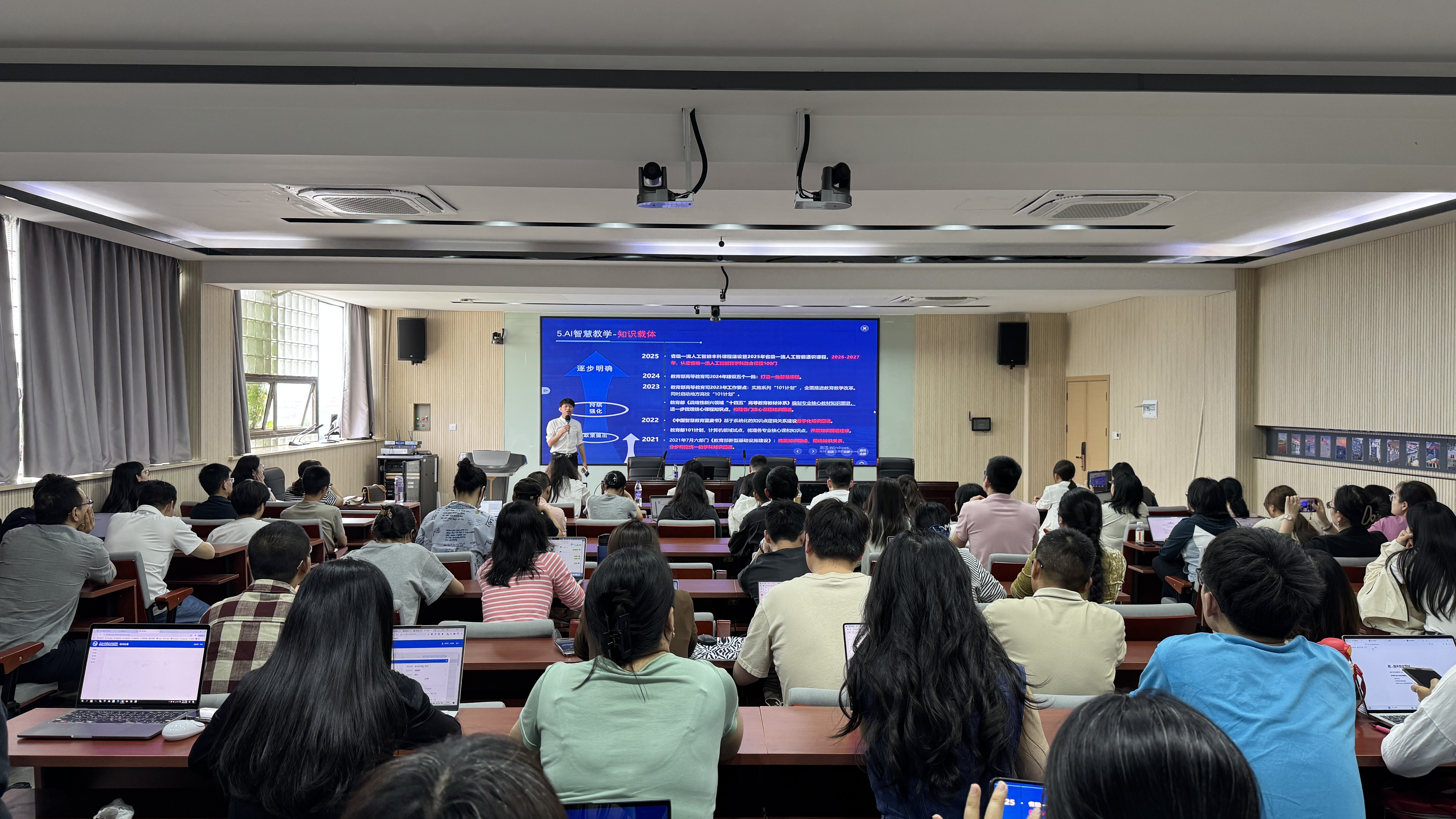 为深入落实国家教育数字化战略行动,推动人工智能与教育教学深度融合,提升教师数字化教学能力及课程建设水平,5月29日下午,学校在教师发展中心报告厅开展“人工智能赋能教育教学改革”专题培训。本次培训会邀请了湖州师范学院教学发展中心主任、教务处副处长徐云杰教授进行智慧课程建设经验分享。教务处相关负责人、学校课程建设项目负责人及骨干教师共计80余人参加培训。