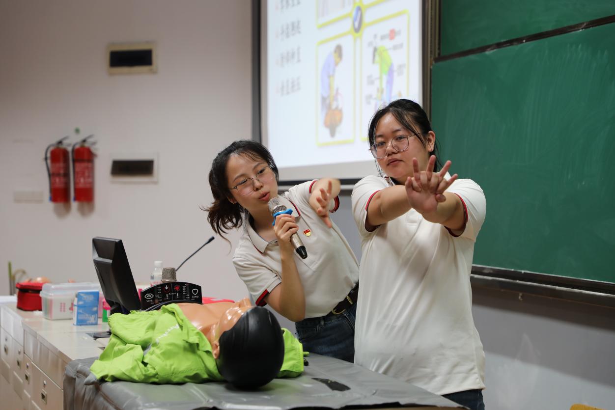 本次培训聚焦应急救护核心需求,特邀义乌市卫生进修学校曹老师、傅老师担任主讲。课堂上,授课教师结合生动动画演示、真实急救案例与现场教学示范,围绕心肺复苏术(CPR)、海姆立克急救法、体外自动除颤仪(AED)使用等关键内容展开详细讲解。从急救黄金时间的把握,到心肺复苏按压深度与频率的规范,再到AED开机操作的每一个步骤,教师均逐一拆解、耐心答疑,确保理论知识传递精准易懂,为学子搭建扎实的急救知识框架。