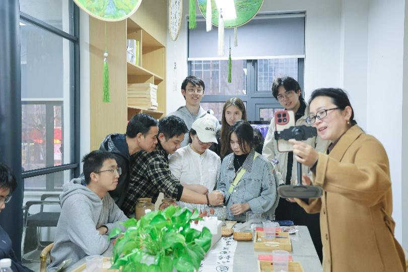 在公司合香珠非遗传承体验基地,学院多语跨境电商直播中心负责人、跨境播创·技能大师工作室熊艾莎老师热情接待研学团。她详细介绍了学院跨境电商直播校企合作模式。依托技能大师工作室资源,推行跨境电商直播现代学徒制项目,将非遗技艺传承与电商运营技能培养相结合,让非遗产品借数字渠道走向全球,在产教融合实践中探索高技能人才培育新路径。研学团师生近距离观摩非遗制作与跨境电商直播实操,对“非遗+跨境”融合模式饶有兴趣。