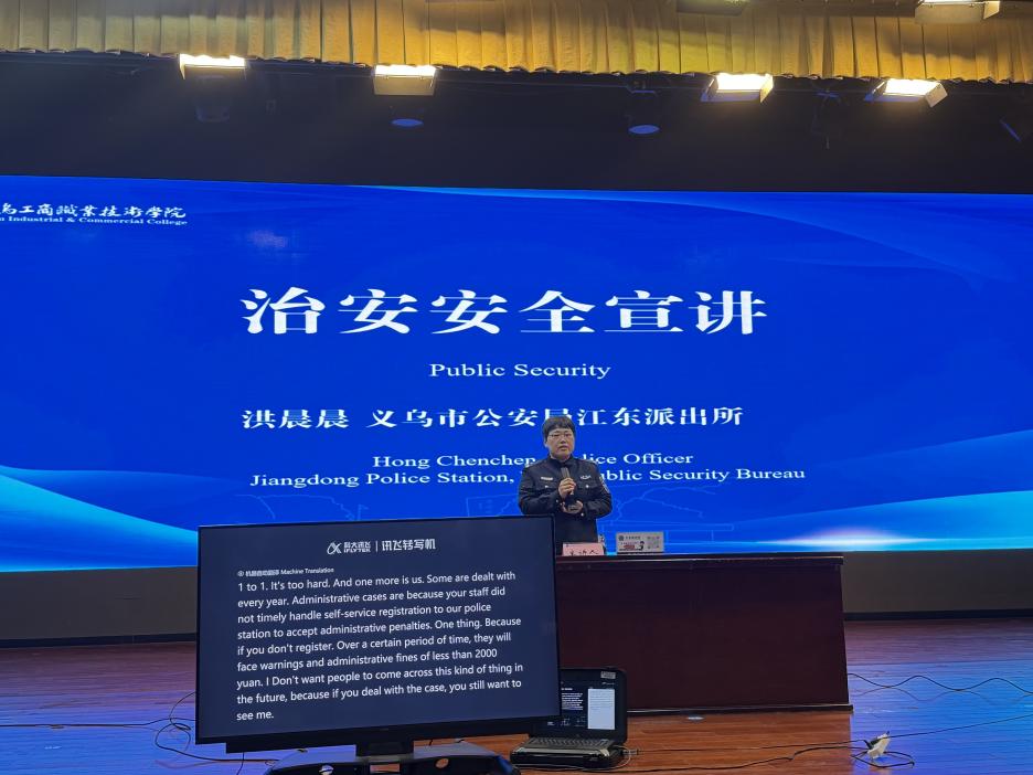 4月1日上午,国际教育学院联合学校安全保卫部,在丹溪文化厅举办“友聚浙里 义路平安”国际学生安全教育宣讲会。本次活动特邀义乌市公安局交警大队江东中队、江东派出所、出入境管理局民警现场授课,全体国际学生参加。
