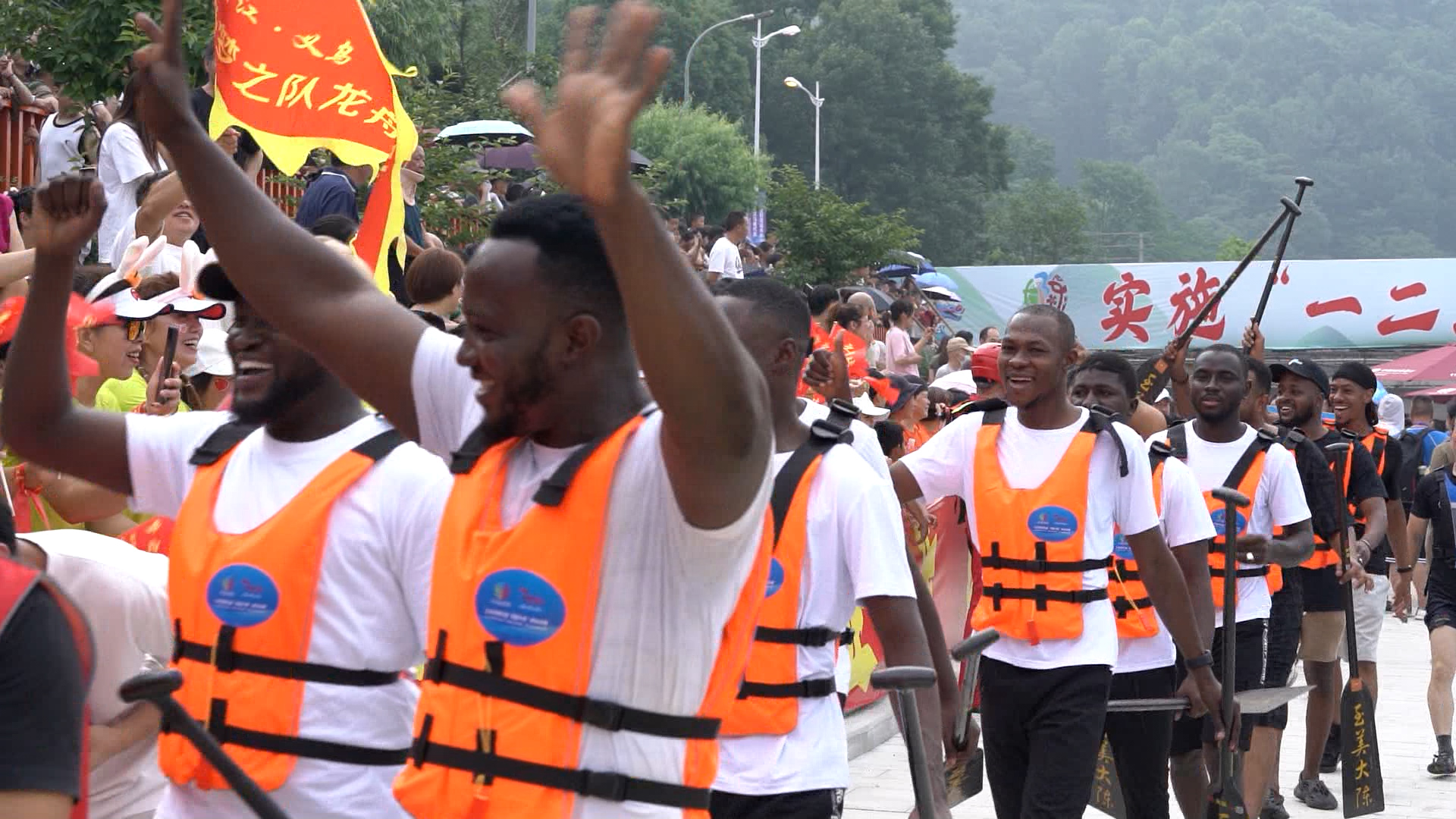 此次龙舟赛是逆行而上300米直道竞速,共有31支队伍,460多人参赛,采用的是12人制龙舟,集竞技性和观赏性于一体。在这场端午赛事里,有三支队伍格外显眼。这三支龙舟队伍由三十余名外籍学生和在义乌的外国友人组成,他们来自10余个国家,国际范十足。选手们奋力挥桨,动作整齐划一,气势如虹,在赛场上表演了一把“速度与激情”,让参赛选手和观众都更深刻地体验到了中国传统文化的魅力。