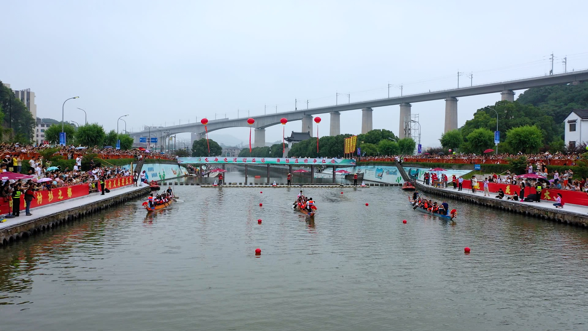 “棹影斡波飞万剑,鼓声劈浪鸣千雷。”在义乌大陈红旗村的丁店河畔里,伴随着观众一声声的呐喊助威,一场别开生面的国际龙舟友谊赛开赛了。选手们奋力挥桨,热闹非凡。