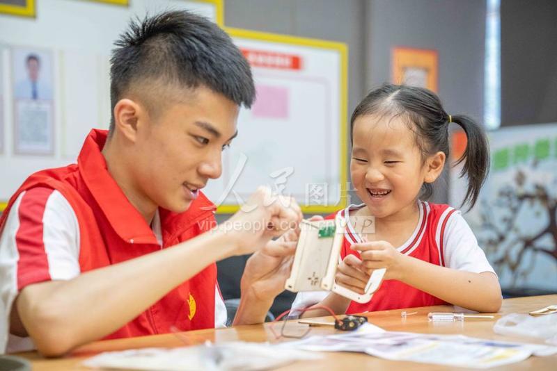 2023年7月10日,浙江省义乌市佛堂镇党群服务中心“家门口的暑托班”里,教师志愿者正在为小朋友们普及安全用电知识。