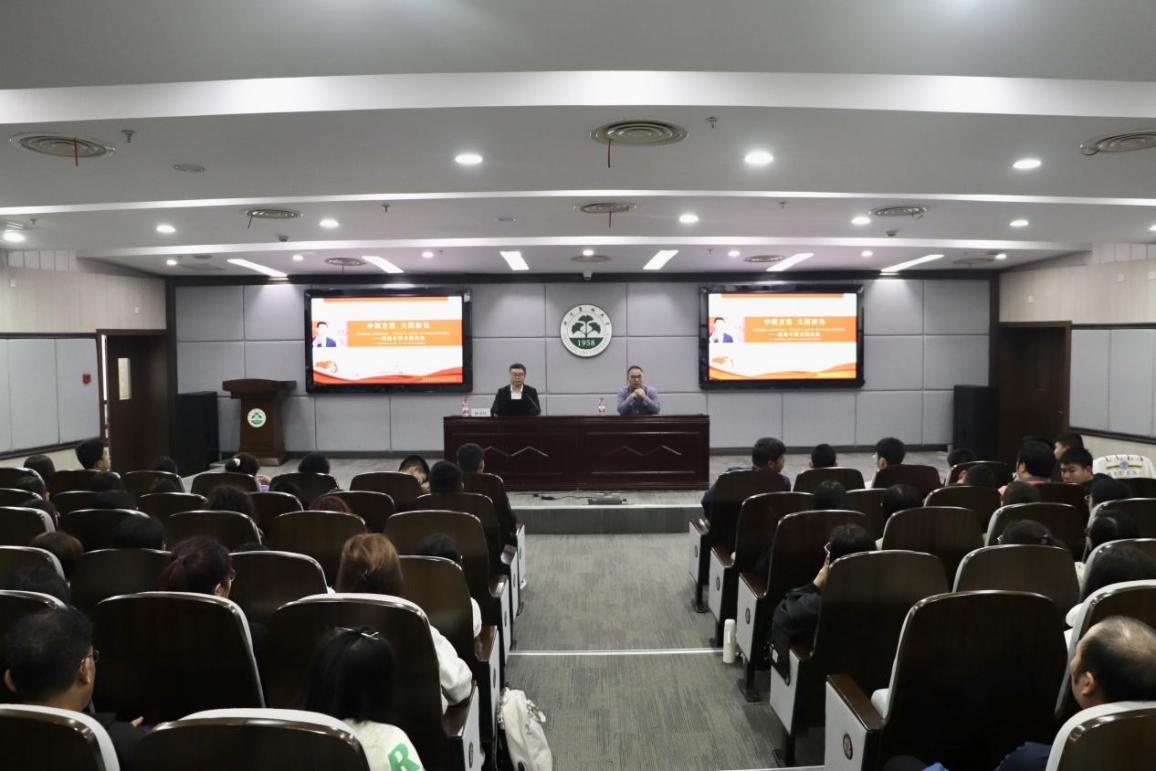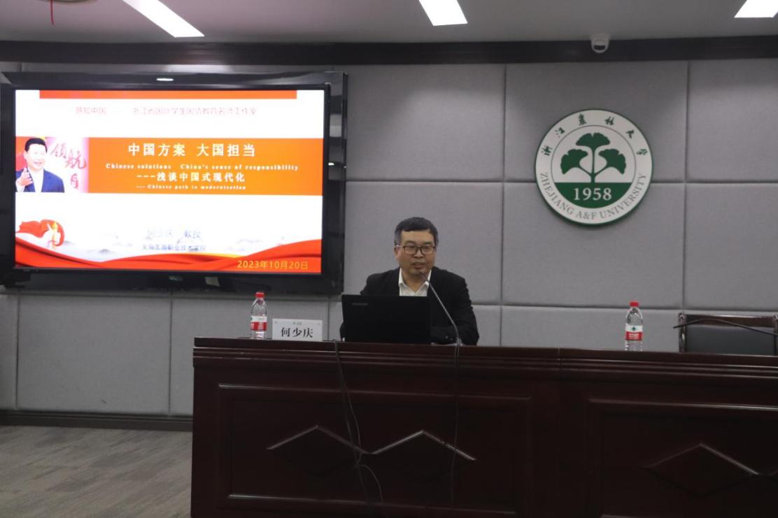 义乌工商职业技术学院国际学生国情教育名师工作室负责人何少庆受邀作题为“中国方案大国担当——浅谈中国式现代化”的专题报告。浙江农林大学百余名教育部语合中心国际中文教师奖学金的语言生和“中文+职业技术”硕士生出席了国情教育专题讲座。何少庆从中国式现代化的历史演进、五大特色及对世界的贡献,通过浙江“千万工程”、数字经济等案例,系统阐述了中国式现代化在浙江的成功实践。讲座内容丰富详实,深受广大留学生的喜爱。