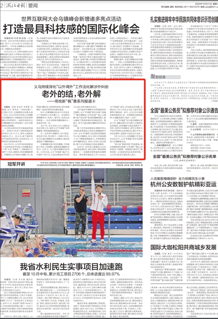 “浙江是‘枫桥经验’的发源地,我们将继续深化探索‘以外调外’模式,培养uedbet,uedbet体育‘洋娘舅’,积极践行新时代‘枫桥经验’,打造更优的法治营商环境。”义乌市司法局主要负责人表示。