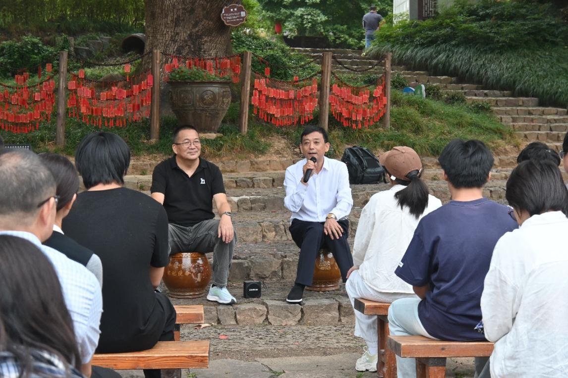 经验分享,共话未来。签约授牌结束后,陇头朱村党委书记朱根喜和缸窑村党总支书记陈跃俊分别分享了两个村庄的先进发展经验,他们通过挖掘乡村历史文化和特色产业,打造乡村品牌,大力发展乡村农业和旅游经济,不断追求乡村快速发展和村民共同富裕。分享过后,两位村书记还与学生们进行了深入交流,当被问到现阶段村庄发展面临什么瓶颈时,他们都谈到了乡村发展需要“留”下两类人,一是让前来游玩的人流连忘返,二是让前来创业的人扎根乡土。讲到动情之处,两位书记更是热烈欢迎同学们把专业所学带到两个村子的建设中,把真才实干投入到乡村振兴的发展中。