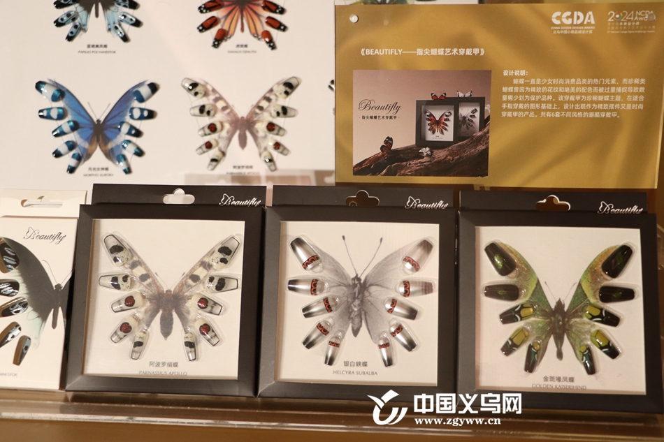 经过一天激烈的角逐,来自江西财经大学的王君选手凭借作品《Beautifly-指尖蝴蝶艺术穿戴甲》,最终摘得金鹁鸪奖,赢得大赛30万奖金,“我已经是第三次参赛了,每次都有不同的收获,像这次参赛作品也已在义乌市场落地,受到了各大知名商业展会以及海外市场的认可。”获得金鹁鸪奖的王君表示,该作品创意想法来源于珍稀蝴蝶,蝴蝶一直是少女时尚消费品类的热门元素,而珍稀类蝴蝶曾因为精致的花纹和绝美的配色而被过量捕捉导致数量稀少、划为保护品种,该作品正是在适合手指穿戴的图形基础上,将蝴蝶相关图案延伸创作、设计出既可作为精致摆件又能成为时尚单品的穿戴甲。