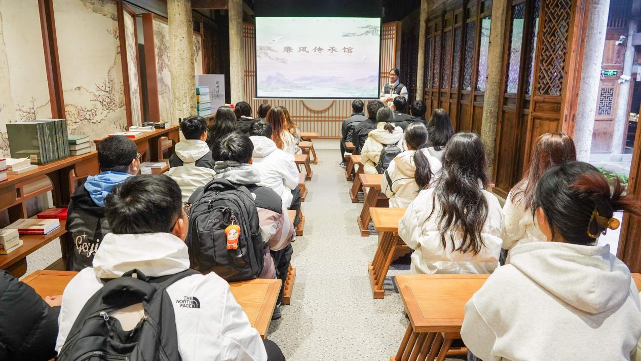 应氏承廉厅里,学子们从应氏的家规家训中感受到了廉洁之风在中国的深远历史传承;尽责守廉厅,通过胡则等当地历史名人为官尽职尽责,恪守廉洁奉公的节操的众多故事,众学子理解了作为学生干部要以身作则廉洁行事;在匠心养廉厅,讲解员介绍了当地的匠人们为了心中的信念诚信经营,将锡雕等非物质文化遗产代代传承的美谈,为学子们诚信创业做了模范引领;英韵倡廉厅展示了新时代清廉建设的最新成果,也让学子们体悟到了廉洁建设永远在路上的真谛;在警示教育厅,党员学子们重温了党纪党规,同时也在一个个鲜活的警示案例中获得了深刻的警醒。
