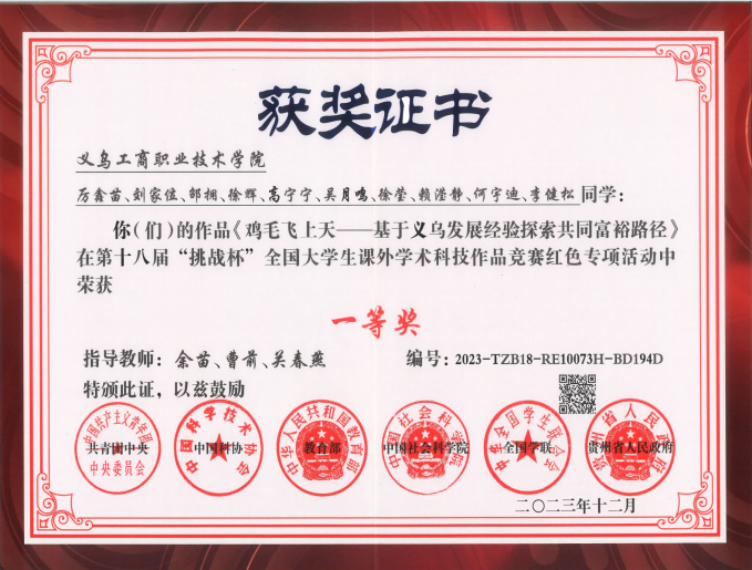事实确实如此,自2022年9月入校以来,她曾荣获优秀共产党员、优秀班主任、工会积极分子等荣誉称号,教学业绩考核A等。先后指导学生参加“挑战杯”、“互联网+”等竞赛8项,其中6项荣获省级奖项以上。2023年指导的《鸡毛飞上天-基于义乌发展经验探索共同富裕路径》荣获第十八届“挑战杯”大学生课外学术科技作品竞赛红色专项赛国家一等奖,取得学校历史性的突破。