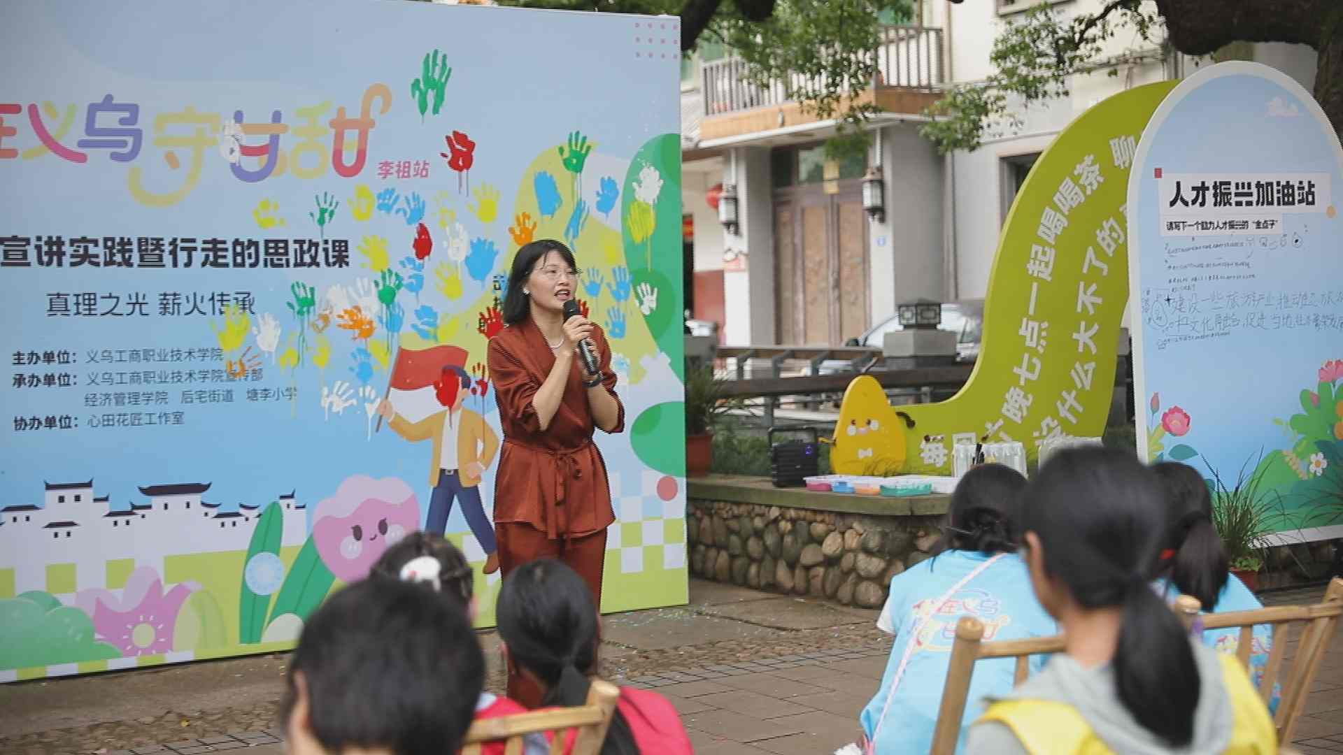 活动现场呈现跨越时空的对话场景:小学生们用童声演绎《我的梦想和祖国紧紧相连》,青年学子剖析共富实践案例《开在花园里的共富之花》,教育工作者则通过《义乌换衣记》展现改革创新的理论脉络。三个年龄段的讲述者以差异化视角,构建起从感性认知到理性思考的教育链条。