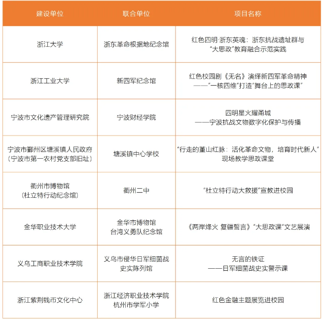 近日,教育部、国家文物局公布了以中国人民抗日战争暨世界反法西斯战争胜利80周年为主题的大中小学“大思政课”优质资源建设推介项目名单。其中,浙江8个项目入选精品项目名单(100项)。