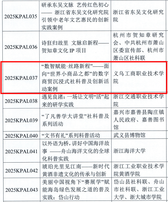 近日,浙江省社会科学界联合会公布了2025年度浙江省“社科普及创新活动案例、红色基地精品活动案例”名单,义乌工商职业技术学院“数字商贸”社科之家申报的“数智赋能?丝路新程”数字商贸沉浸式社科普及创新活动案例成功入选,标志着该校在推动科普工作、促进科教资源科普化方面取得了新的突破。