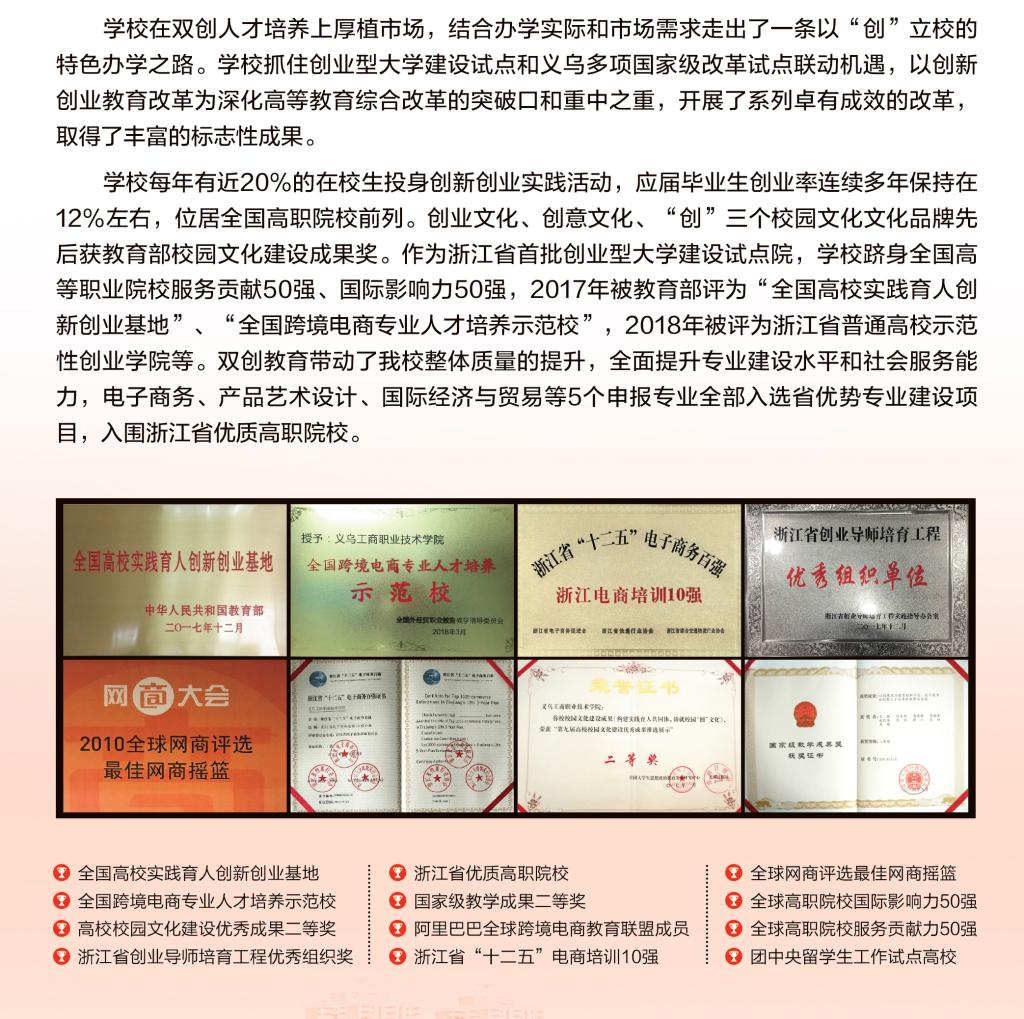义乌工商职业技术学院系公办高职院校,是浙江省高职高水平学校、浙江省优质高职院校、首批浙江省创业型大学建设试点院校,跻身全国高等职业院校育人成效50强、服务贡献50强、国际影响力50强,荣登全国创新创业典型经验高校,获评全国高校实践育人创新创业基地。