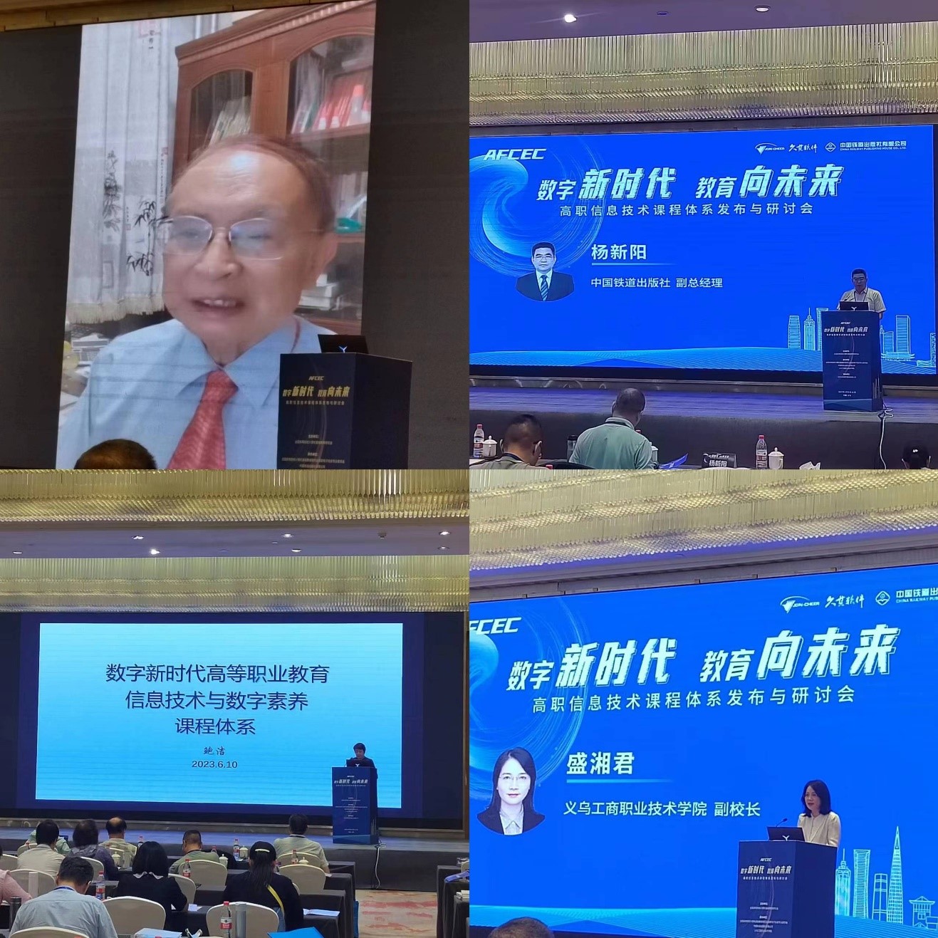近日,“数字新时代,教育向未来——高职信息技术课程体系发布与研讨会”在浙江义乌举办,全国高等院校计算机基础教育研究会在会上发布《数字新时代高等职业教育信息技术与数字素养课程体系》(简称:《课程体系》)及配套教材。《课程体系》研制项目组组长高林、副组长鲍洁、眭碧霞、盛鸿宇、曹建林、叶曲炜、芦星、秦绪好等参加了会议。计算机教育专家谭浩强、全国高等院校计算机基础教育研究会会长黄心渊、北京久其软件股份有限公司高级副总裁曾超、中国铁道出版社副总经理杨新阳受邀参加会议。本次会议由学校机电信息学院承办,副院长盛湘君出席会议并致辞。