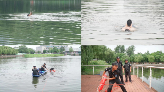 根据防溺水演练预案,本次活动分为指挥组、报警组、溺水施援组和救护组。各组分工明确,各就各位,确保演练活动万无一失。演练开始前,江东派出所楼仁斌副所长就演练过程容易出现的问题及相关注意事项作了详细讲解,各组现场展示了间接赴救、借助器材直接赴救、徒手直接赴救、施救过程中被溺水者抓抱的解脱技术,以及心肺复苏等。演练活动以路人发现水中有溺水人员呼喊救命为切入点,路人拨打电话至校园报警中心,保安快速响应,通过划动木舟和抛甩救生圈双线并进对溺水人员进行及时救援;待溺水人员上岸转移至安全位置,由救护组对其进行心肺复苏并及时送完医院,整个过程执行迅速、有条不紊。