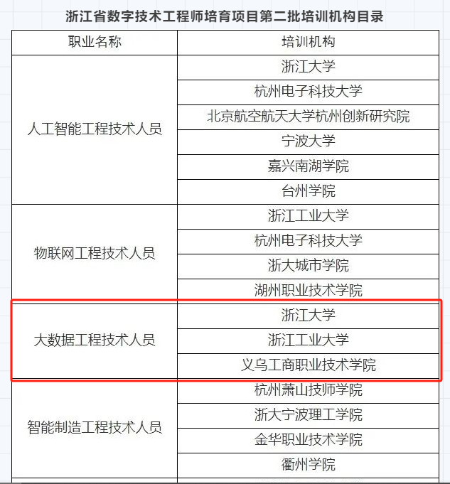 近日,浙江省人力资源和社会保障厅公布了浙江省数字技术工程师培育项目第二批培训机构名单,学校机电信息学院牵头申报的项目顺利入围,成为浙江省数字技术工程师培育项目大数据工程技术人员培训机构。