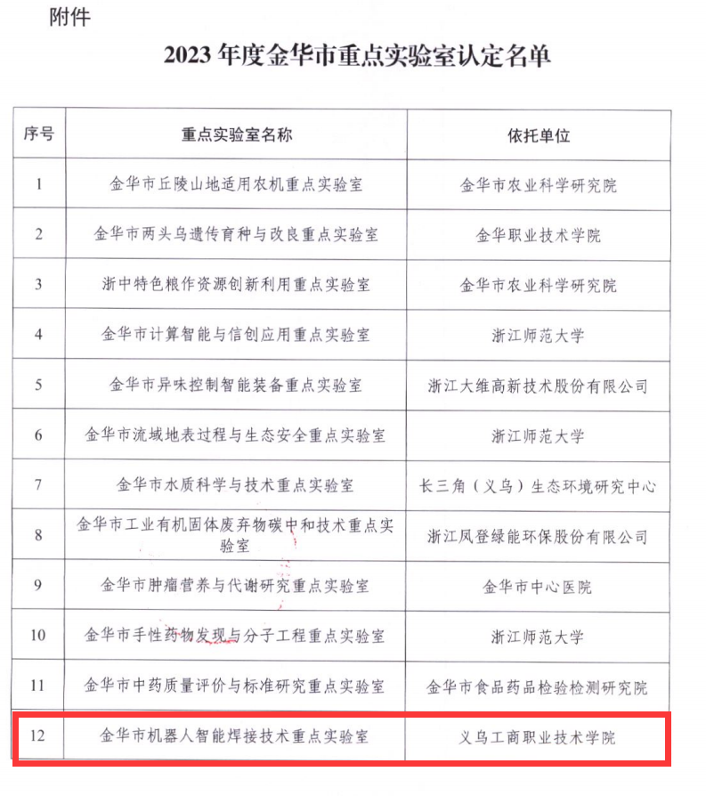 11月3日,金华市科学技术局正式发布了《uedbet,uedbet体育印发2023年度金华市重点实验室认定名单的通知》。uedbet,uedbet体育机电信息学院“机器人智能焊接技术重点实验室”精心准备,历时8个月,经过申报、答辩、现场核查等多个环节成功入选。