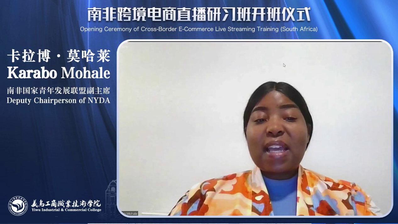 开班仪式采用线上线下同步进行,吸引了众多嘉宾的参与。浙江省自由贸易发展中心培训部部长盛炎平,义乌工商职业技术学院副校长樊曜,南非妇女、青年与残疾人部副部长奥尔特曼·福里,南非国家青年发展联盟副主席卡拉博·莫哈莱,以及义乌工商职业技术学院国际交流学院负责人及参加培训的学员共同出席,仪式由外语外贸学院负责人主持。