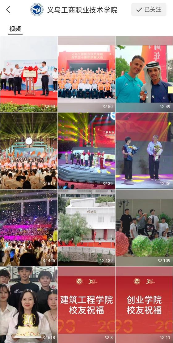 为庆祝办学30周年,学校举办“‘创’出精彩——三秩芳华 踔厉奋发”校庆文艺展演、校庆大会、校史馆开馆仪式、师生摄影展等系列活动,设立“庆祝办学30周年”融媒体报道专题,通过线上线下传播、城校互联互动、海外海内直播等方式,一是全方位精心策划,内容兼具深度广度;二是多形态呈现盛况,传播方式多元新颖;三是多平台传播矩阵,新媒体运营及时有效,全面展现了学校的辉煌历程、办学成果和发展愿景,讲好义乌工商职院筚路蓝缕的办学史、广大师生员工开拓进取的创业史和毕业校友奋发图强的追梦史,反映了“义乌发展经验”的生动实践,续写城校共荣的佳话。