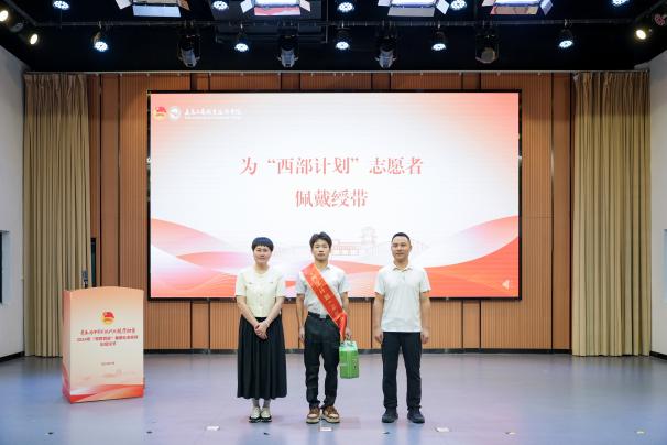 为西部计划志愿者佩戴绶带、赠送纪念品