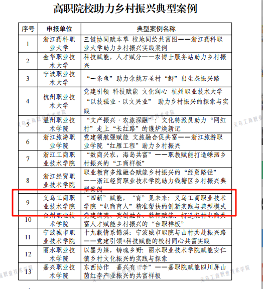 近日,10月21日,浙江省教育厅公布了《第四届高校助力乡村振兴典型案例》评选结果,通过高校自主申报及互评、专家评审、省教育厅会评等环节,择优遴出助力乡村振兴典型案例30项(本科院校15项、高职院校15项)。uedbet,uedbet体育报送的《“四新”赋能,“育”见未来:义乌工商职业技术学院“电商育人”精准帮扶的创新实践与典型模式》案例成功入选。
