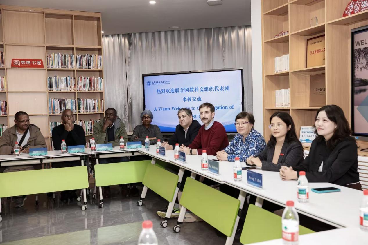 徐美燕对访学团的来访表示热烈欢迎,简要介绍了学校办学情况和创业教育、创意教育、国际教育三大办学特色,融合三大办学特色,学校累计培养了来自38个非洲国家的1190名国际学生,在摩洛哥建设义乌丝路学院,培养了一大批中国和非洲经贸往来和人文交流使者;期待与联合国教科文组织加强交流,深化合作,共同推进全球教育命运共同体建设。