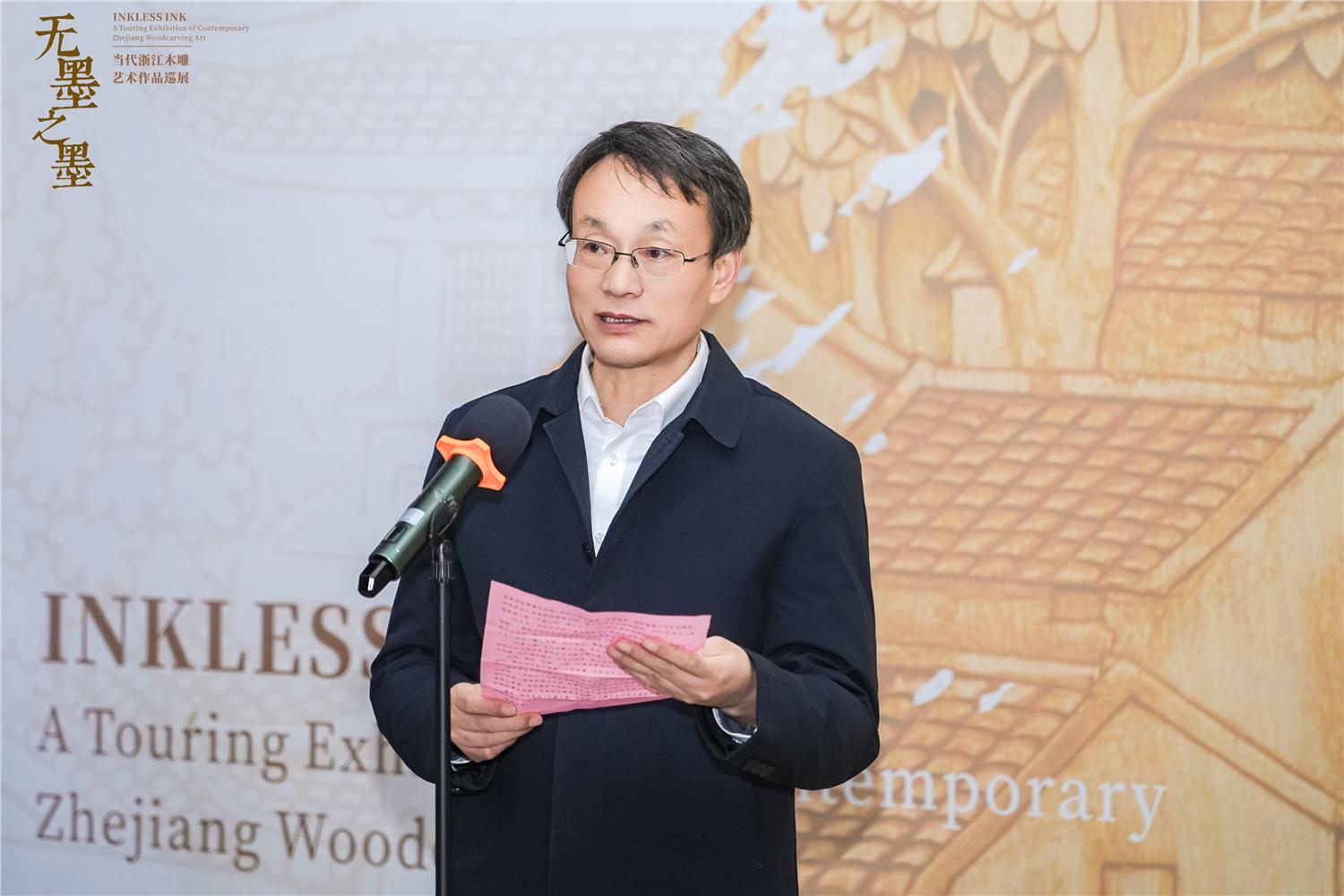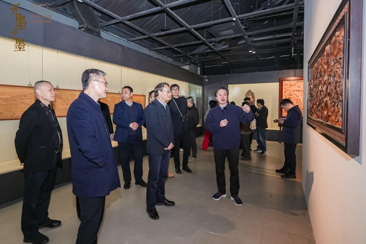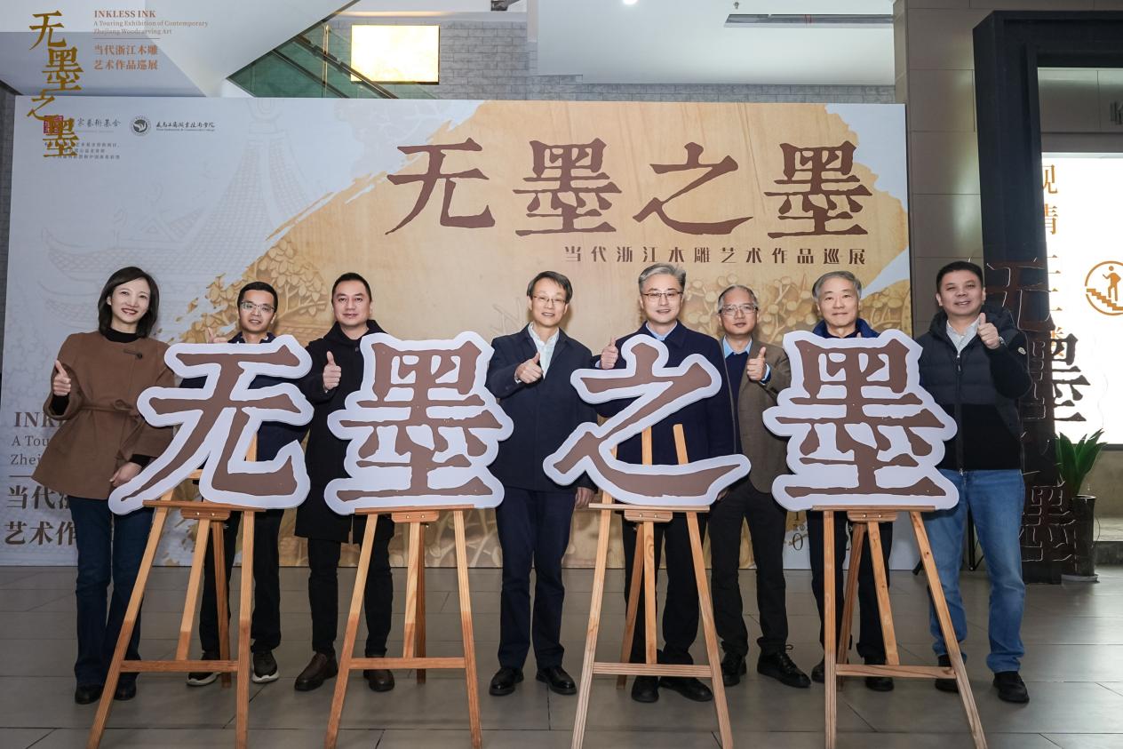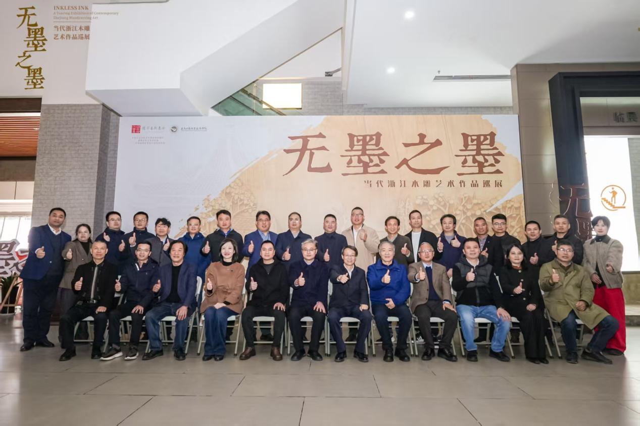 作为巡展继北京、合肥、上海后的第四站,杭州站吸引了艺术界、教育界及文化领域众多领导与嘉宾齐聚运河畔。开幕式上,义乌工商职业技术学院党委书记李昌祖、浙江艺术职业学院党委书记薛亮、浙江省文联创研处处长郑斯奇、杭州工艺美术博物馆馆长陈刚、中共金华市委宣传部副部长陈晓峰、杭州工艺美术博物馆副馆长吕昂、义乌工商职业技术学院副院长盛湘君、项目策展人清华大学美术学院教授王建中、浙江省民间文艺家协会副主席兼秘书长徐新、中国美院雕塑系主任钱云可、义乌工商职业技术学院创意设计学院负责人、亚太手工艺大师高公博、浙江省工艺美术行业协会会长徐伟军、中国工艺美术大师李凤荣,以及13位浙江省工艺美术大师代表共同出席。上午9时,李昌祖、薛亮、陈刚、陈晓峰、郑斯奇、王建中、徐新、徐伟军共同为杭州站展览揭幕,标志着这场国家艺术基金资助项目“无墨之墨:当代浙江木雕艺术作品巡展”正式落地杭州。