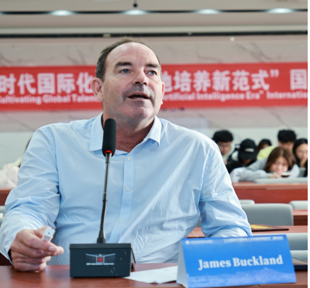 中新合作办学项目教学团队外教Daymon Heyzer和James Buckland结合教学实践,指出当前教学与考核中面临的现实挑战,并提出具有针对性与操作性的应对策略。他们强调,“人工智能绝不可削弱人类的想象、思辨与领悟之力”,为现场师生带来深刻启发。