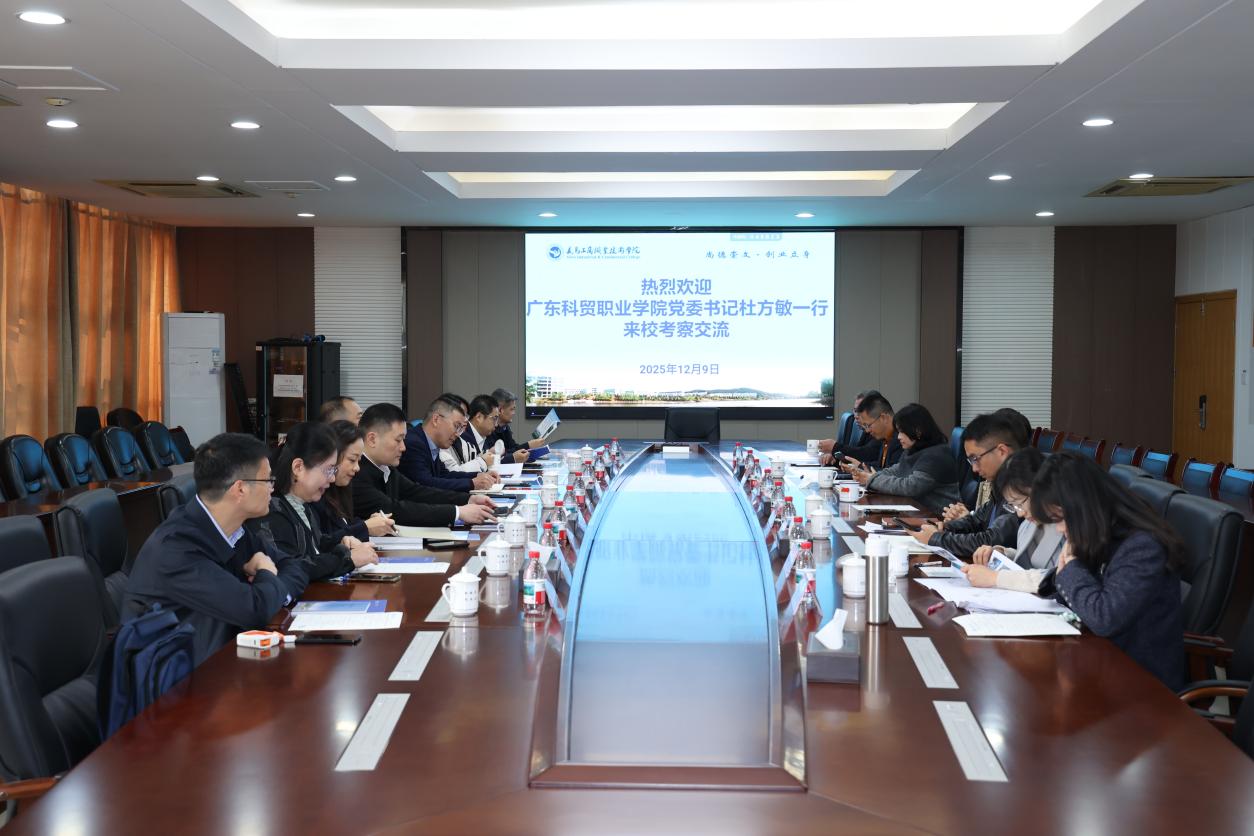12月9日上午,广东科贸职业学院党委书记杜方敏一行来校考察。学校党委书记李昌祖,党委委员、副院长徐美燕,党委委员、组织部部长、统战部部长彭春燕以及创业学院、外语外贸学院等相关负责人陪同考察并开展座谈交流。