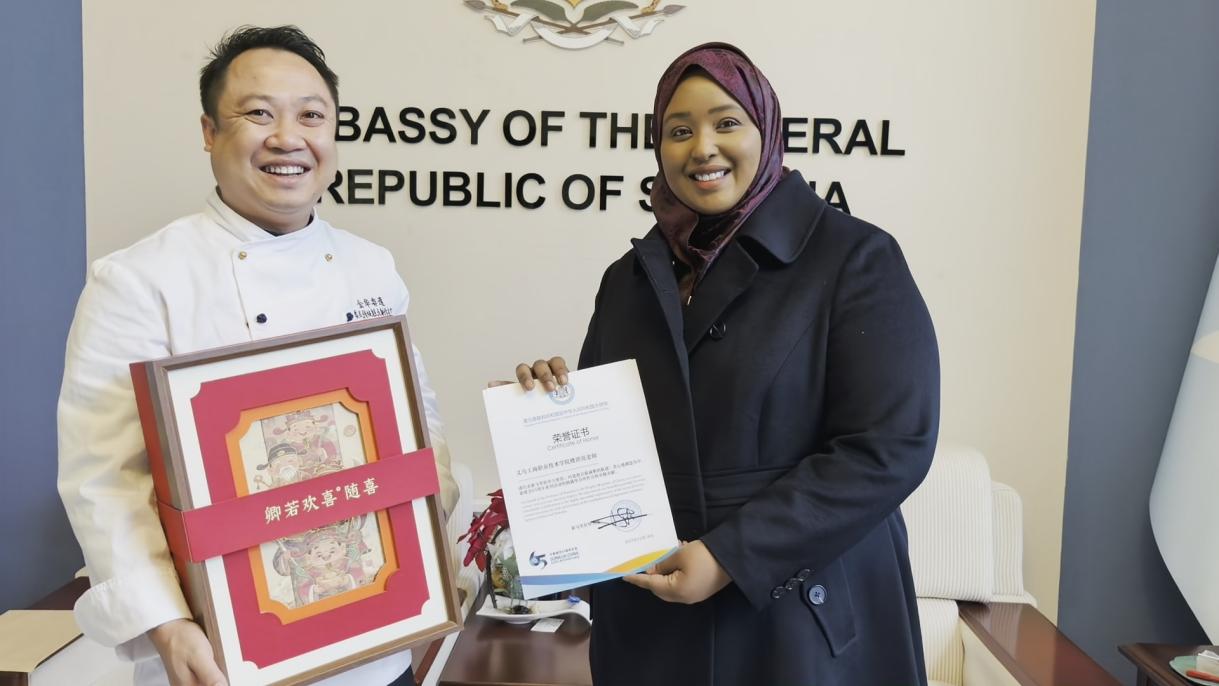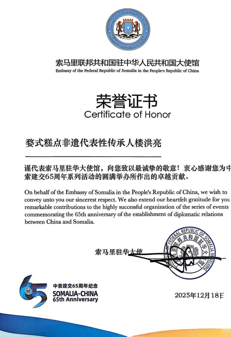 12月18日,中华人民共和国与索马里联邦共和国迎来建交65周年纪念日,双方在北京隆重举行纪念招待会。会上,uedbet,uedbet体育教师、婺式糕点非遗传承人楼洪亮带着一份承载着金华人民深情厚意与非遗匠心的特殊礼物惊艳亮相。这份礼物不仅是对两国65载深厚友谊的致敬,更是金华非物质文化遗产走向世界的一次生动实践,以中华独有的文化语言,娓娓道来一段跨越山海的中索情谊。