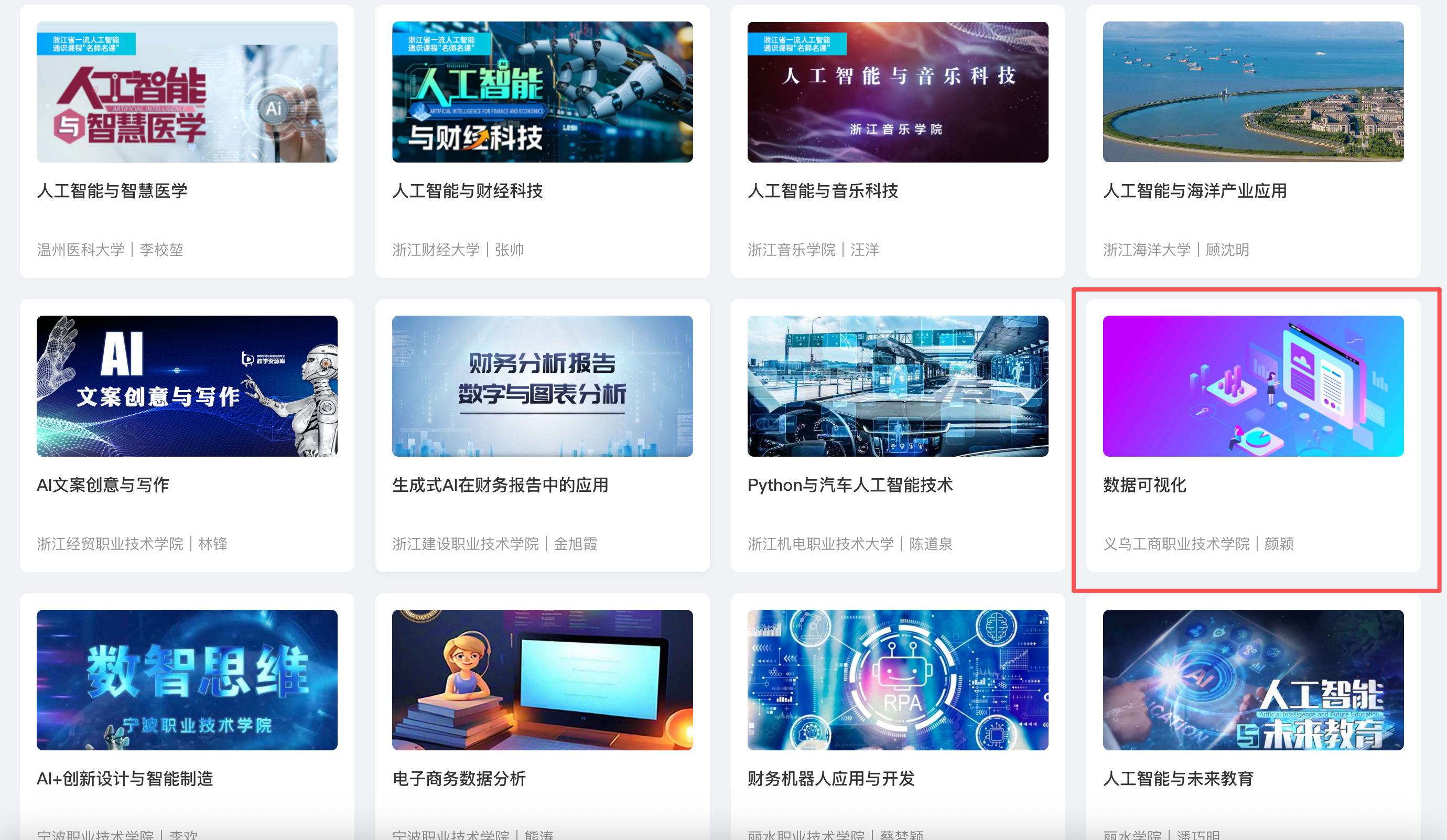 建成一系列AI智能优课。为进一步推动人工智能与教育教学的深度融合,培养师生的人工智能素养和能力,构建人工智能课程培育机制,针对不同类型的专业,分层分类分批次规划建设职业教育一流人工智能通识课程、专业核心课程、特色交叉课程,形成“通识普及—专业深耕—交叉创新”的人工智能课程体系。目前,学校在已有课程资源建设基础上,智能化改造升级课程50余门,开展第一批人工智能课程建设项目(目前已培育28门),立项省级人工智能一流课程3门,《数据可视化》课程已在浙江省高等教育人工智能课程学习平台展示。