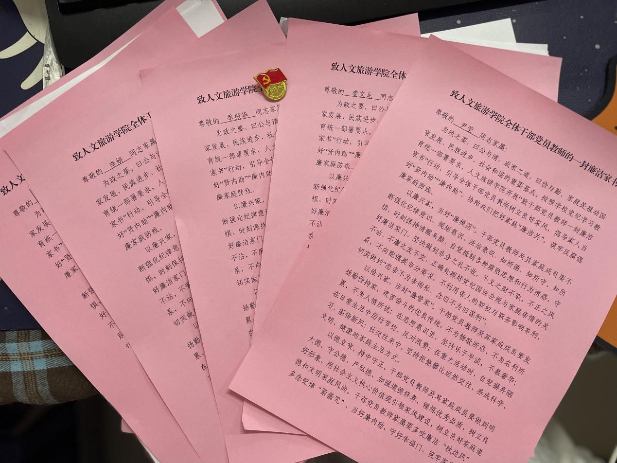 之后在学院会议室开展了“四个一”行动,行动主要为接受一次廉政谈话、签订一份廉政承诺书、参加一次党规党纪培训、撰写一封廉洁家书。会上组织全体党员教师撰写廉洁家书,倡树清廉家风,充分发挥家庭促廉助廉的重要作用。