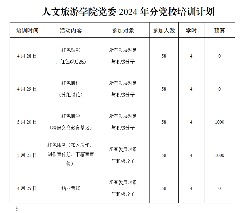 为高质量完成发展党员工作,强化志愿入党学员的党性意识,提高党员发展对象的理论素养,提升党员服务意识,人文旅游学院于4-5月开展了学院分党校培训班,培训内容分别为:一场红色观影、一次红色研讨、一场红色研学、一次红色服务。我院全体党的发展对象、入党积极分子参加此次培训。