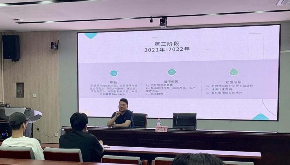 为充分激发学生创业热情,充分利用时间开展创业活动,3月29日,学校在望道楼419开展了创新创业训练营第七讲。本次活动特别邀请了优秀校友、义乌市逸豪科技有限公司创始人田逸豪为大家分享创业经验。他从大一就开始创业,经历三次沉浮,三次总结,才有了今天的成绩。